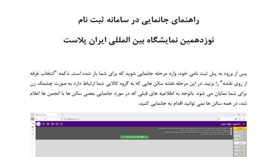 مشارکت کنندگان محترم نوزدهمین نمایشگاه بین المللی ایران پلاست، با توجه به آغاز فرایند جانمایی نمایشگاه طبق برنامه زمانی زیر، خواهشمند است ابتدا فایل راهنمای ثبت نام را از سایت نمایشگاه به نشانی iranplast.nipc.ir  ، منوی راهنمای ثبت نام دریافت و مطالعه فرمایید و سپس در برنامه زمانی مشخص شده اقدام به جانمایی  فرمایید.