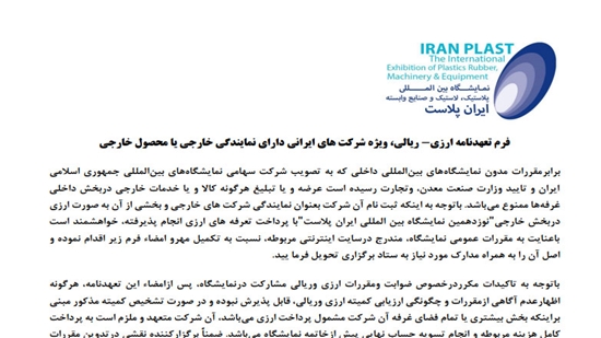 - شرکت کنندگان ایرانی که نماینده یک شرکت خارجی هستند یا در بخشی از غرفه خودشان محصول خارجی را تبلیغ می کنند و غرفه ارزی – ریالی دارند، فرم تعهدنامه ارزی ریالی ویژه بخش خارجی را تکمیل نمایند.